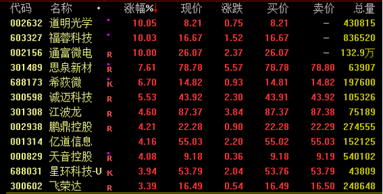 AI手机概念再度活跃,截至收盘,道明光学、福蓉科技、通富微电涨停,思泉新材涨近8%,诚迈科技涨超5%。值得注意的是,福蓉科技近7个交易日已收获6个涨停板。