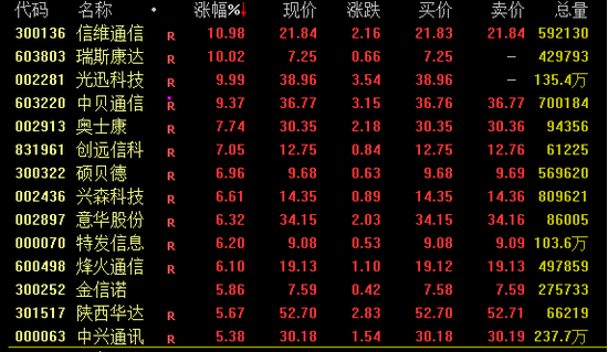 6G概念盘中强势拉升,截至收盘,信维通信涨超10%,瑞斯康达(维权)、光迅科技涨停,中贝通信涨超9%,奥士康、创远信科涨超7%,中兴通讯涨超5%。