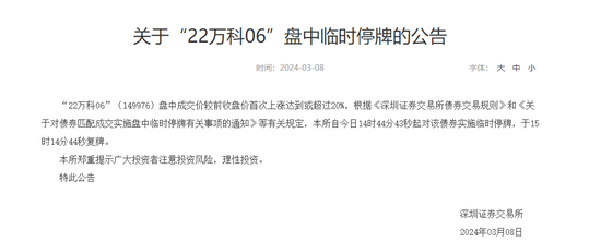 今日,万科多只债券上涨,“22万科06”(149976)一度因大幅上涨触发临停。据深交所午后公告,“22万科06”(149976)盘中成交价较前收盘价首次上涨达到或超过20%,根据《深圳证券交易所债券交易规则》和《关于对债券匹配成交实施盘中临时停牌有关事项的通知》等有关规定,自今日14时44分43秒起对该债券实施临时停牌,于15时14分44秒复牌。