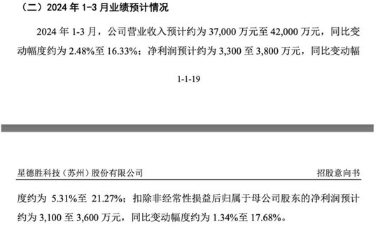 星德胜招股书称,预计2024年一季度实现净利润3300万元至3800万元,同比增长5.31%至21.27%。