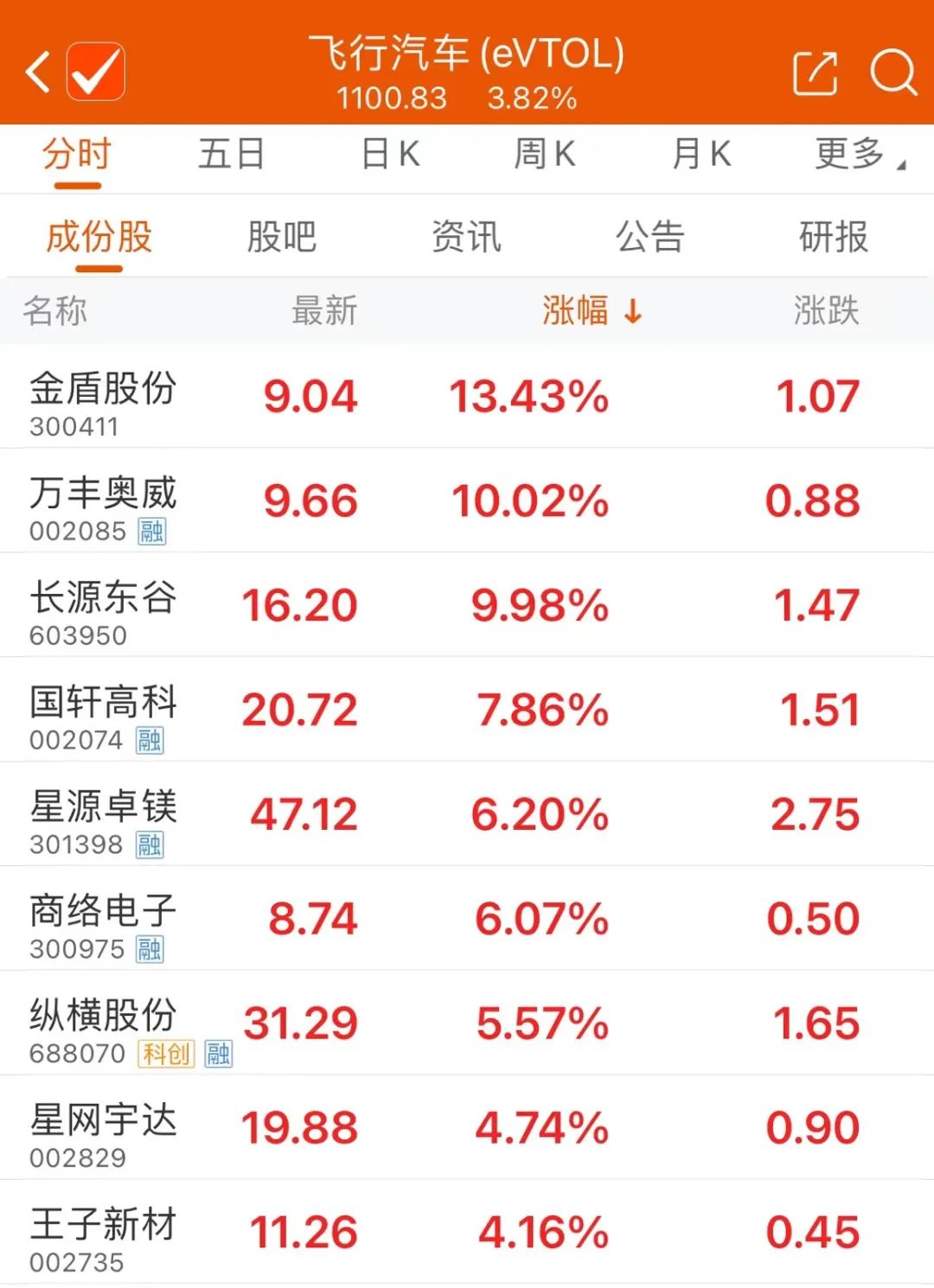 3月11日早盘,飞行汽车概念股表现活跃,金盾股份盘中涨超18%,万丰奥威涨停,长源东谷、商络电子、中信海直等多股跟涨。