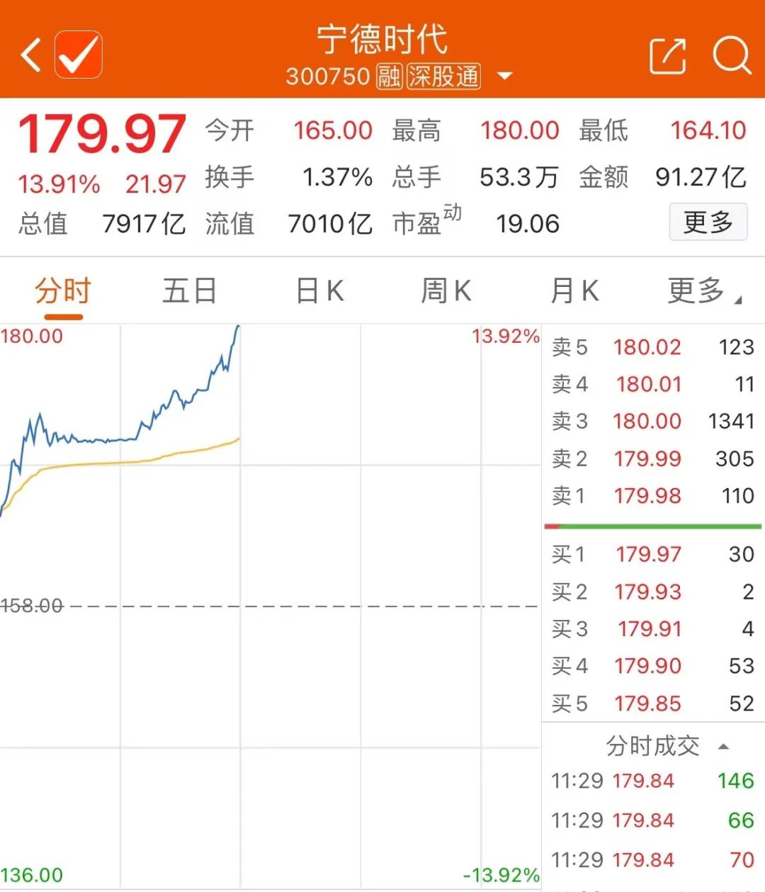 周一上午,宁德时代高开高走,截至午间收盘涨13.91%,报179.97元/股,最新总市值7917亿元。