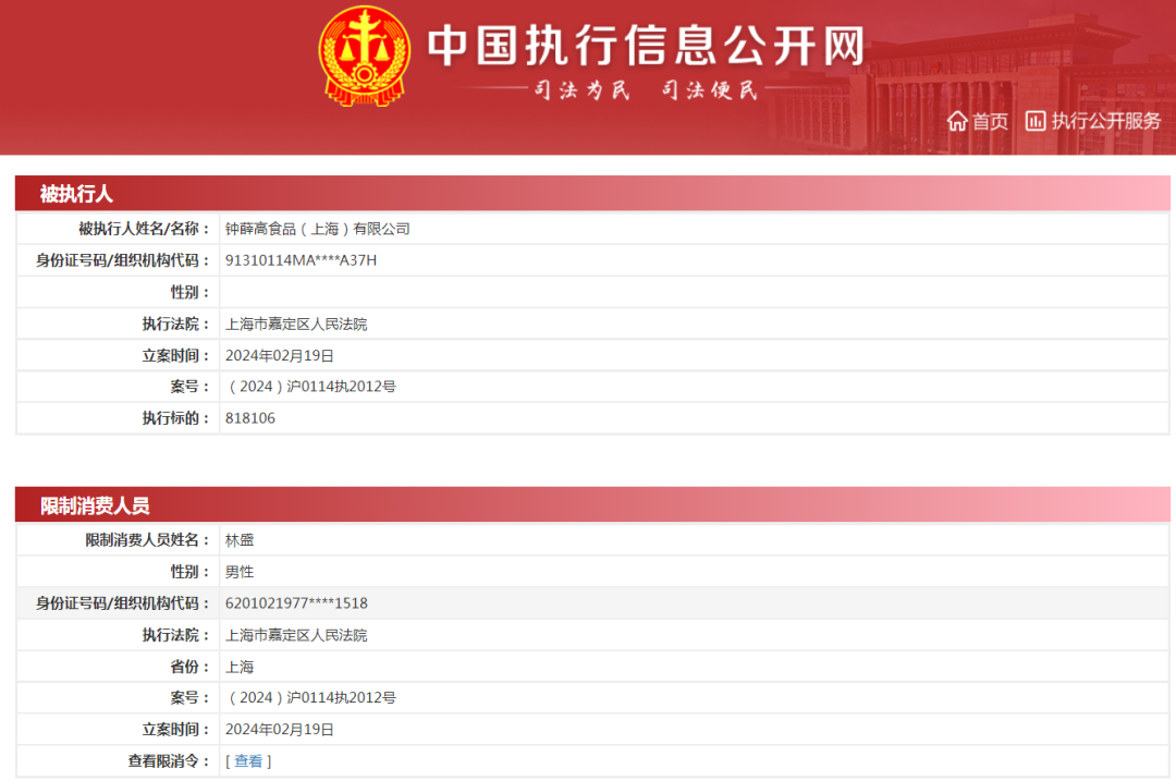 中国执行信息公开网显示,近日,钟薛高食品(上海)有限公司及其法定代表人林盛被限制高消费,执行法院为上海市嘉定区人民法院。关联案件流程显示,此前,该公司已成被执行人,执行标的81.81万元。此外,该公司旗(金麒麟分析师)下分支机构已全部注销。