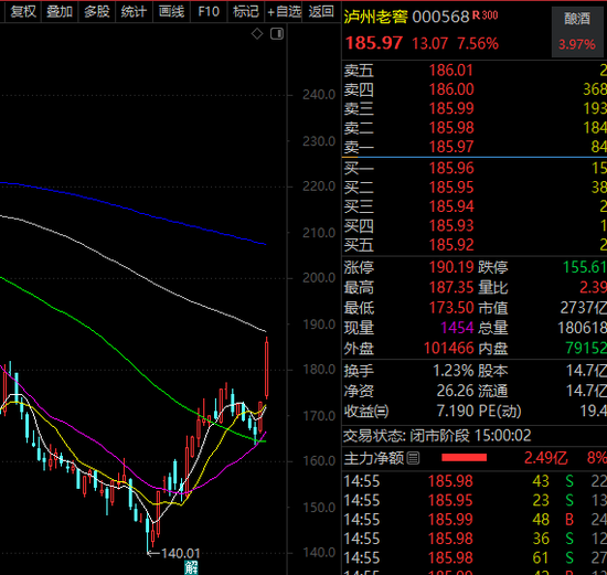 成长型大盘股今天普遍逆市上扬,包括白酒、医药、新能源等,均是成长型大盘股的代表标的。其中,白酒板块的泸州老窖接连大涨,昨天涨幅超过4%,今天涨幅接近8%;A股股王贵州茅台也大涨近3%。
