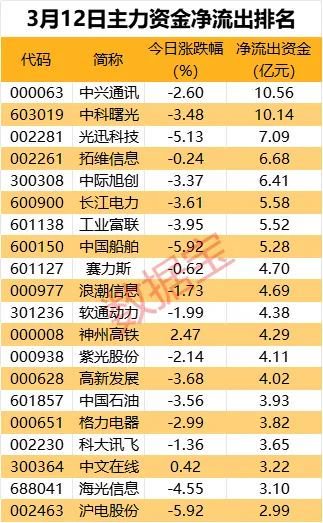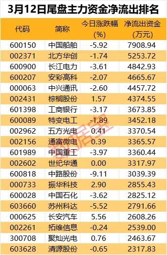中国船舶、北方华创、长江电力、安彩高科、中兴通讯尾盘获主力净流出超4000万元。