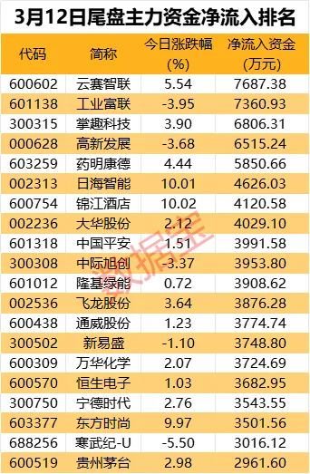 尾盘沪深两市主力资金净流入10.65亿元。个股方面,19股尾盘获主力抢筹超3000万元。云赛智联、工业富联尾盘获主力抢筹超7000万元,掌趣科技、高新发展、药明康德等均获主力抢筹超5000万元。