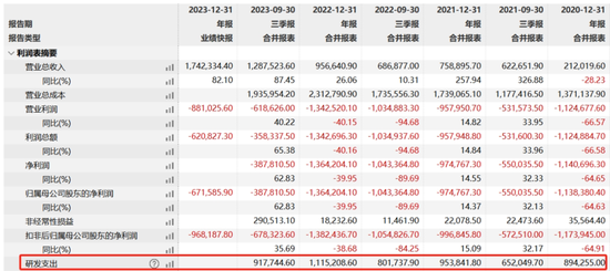 与之对应的是,7年间净利润亏损在扩大,分别为亏损9.82亿元、47.47亿元、69.15亿元、113.84亿元、97.48亿元、136.42亿元。6年合计亏损约474.18亿元。2023年归母净利润为-67.16亿元,亏损有所收窄,7年累计亏损541.34亿元。