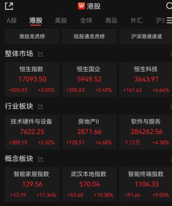 3月12日,港股盘中走强,恒生指数上涨超3%,恒生科技指数上涨超4%,其中地产、资讯科技、医疗保健、必需消费等板块领涨。