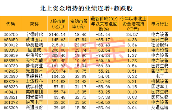 上述这54只高回撤的绩优股中,今年以来按照区间成交均价计算,北上资金增持超亿元的有6只,分别是宁德时代、爱博医疗、华测检测、固德威、中伟股份、天合光能。
