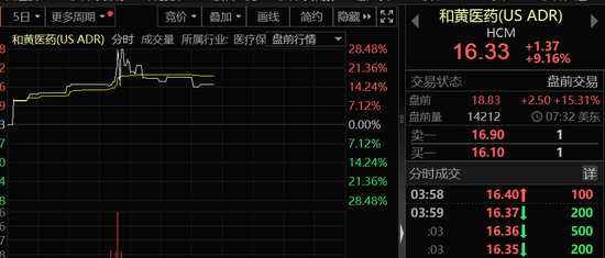 和黄医药美股盘前一度大涨近30%,百济神州美股盘前更是狂拉近17%,再鼎医药美股盘前一度大涨近12%。