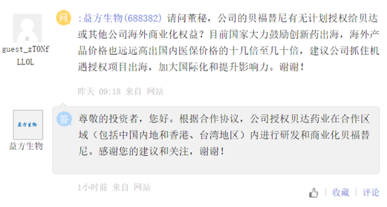 公司的贝福替尼有无计划授权给贝达或其他公司海外商业化权益?目前国家大力鼓励创新药出海,海外产品价格也远远高出国内医保价格的十几倍至几十倍,建议公司抓住机遇授权项目出海,加大国际化和提升影响力。