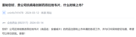 众生药业 [002317] :公司正持续推进昂拉地韦片(商品名:安睿威?)的药品注册和上市申请的各项工作,并与CDE保持密切沟通,希望可以早日获批。