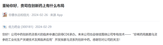 佐力药业 [300181] :公司中药创新药灵香片的临床申请已获得CDE承办。未来公司也会继续围绕公司专有技术——“珍稀药用真菌乌灵参的工业化生产关键技术及其临床应用”开发独家乌灵系列创新中药。