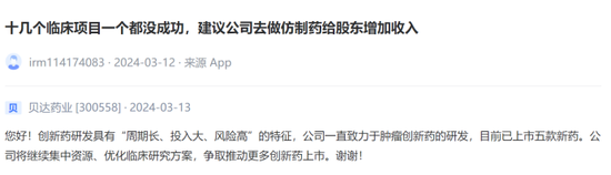 十几个临床项目一个都没成功,建议公司去做仿制药给股东增加收入。