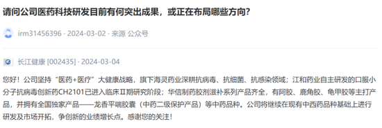 长江健康 [002435] :公司坚持“医药+医疗”大健康战略,旗下海灵药业深耕抗病毒、抗细菌、抗感染领域;江和药业自主研发的口服小分子抗病毒创新药CH2101已进入临床Ⅱ期研究阶段;华信制药胶剂滋补系列产品齐全,有阿胶、鹿角胶、龟甲胶等主打产品,并拥有全国独家产品——龙香平喘胶囊(中药二级保护产品)等中药品种。公司将继续在现有中西药品种基础上进行研发及市场开拓,争创新的业绩增长点。