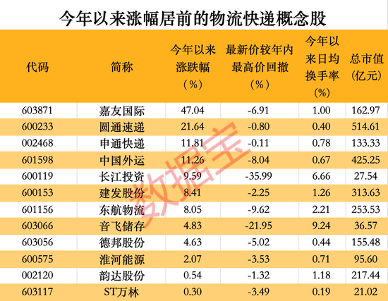 数据宝统计,截至3月15日收盘,A股物流快递概念股中,今年以来,12股涨幅为正值,嘉友国际以47.04%的涨幅排名第一,圆通速递、申通快递、中国外运、长江投资和建发股份等个股紧随其后。