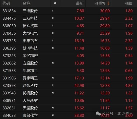 个股出现普涨,245只股票中,仅3只个股收跌。其中三维股份、三友科技、德众汽车3只个股早盘即拉升至封于30cm涨停,股价均创出2月以来新高。此外,大地电气大涨逾25%,还有惠丰钻石等11只股票涨超10%。