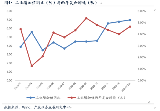 2024年1-2月工业增加值累计同比增长7.0%(去年12月6.8%)。其中采矿业同比增长2.3%(去年12月同比4.7%);制造业同比增长7.7%(去年12月同比7.1%)。