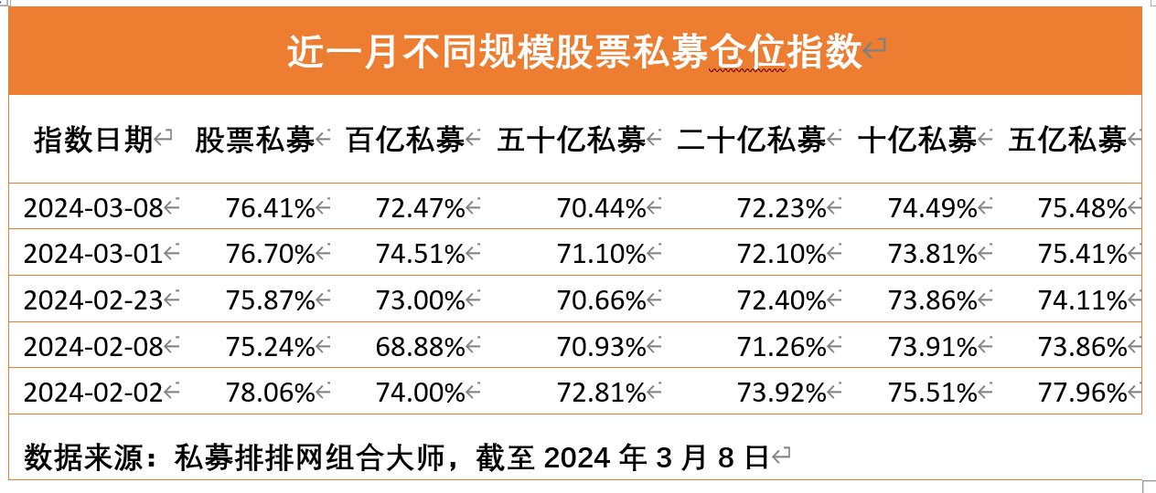 与此同时,私募排排网数据显示,截至3月8日,规模五亿、十亿、二十亿的中小股票私募在A股市场没有出现明显的调整之前,依旧选择继续加仓,最新仓位指数依次为75.48%、74.49%和72.23%,较前一周分别上升0.13个百分点、0.98个百分点、0.07个百分点。