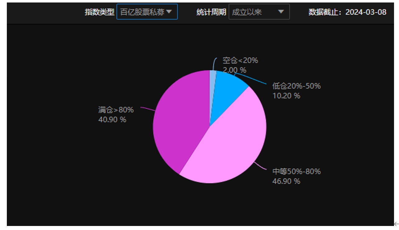 其中,百亿股票私募仓位指数从前一周的74.51%下降至72.47%,下降2.04个百分点,为不同规模私募中,仓位指数下降最多的。从百亿股票私募仓位分布来看,主要减仓的还是处于高仓位状态的百亿股票私募,八成以上仓位的占比为40.90%,较前一周的42.04%下降1.14个百分点。