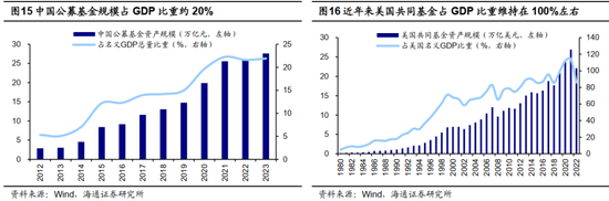 借鉴美国基金发展经验,未来我国公募基金有望迎来进一步发展。实际上,1980年至2022年期间美国的共同基金资产规模从0.13万亿美元升至22.11万亿美元,其相较名义GDP的比例在1980年时仅为5%,而该比例在近五年维持在100%左右;相较而言,2023年我国公募基金整体规模27.6万亿元,相较名义GDP的比例仅22%,仍有较大的发展空间。对比两国基金行业及名义GDP的增速,1980年代以来美国共同基金规模年化增速为13%、名义GDP年化增速为5%,2005年以来我国公募基金规模年化增速26%、名义GDP年化增速11%,可以发现从两国历史经验来看公募基金规模长期年化增速约是名义GDP增速的两倍,因此我国公募基金规模仍有望维持较高的年化增长。未来随着我国居民资金逐渐从房市迁移向权益,庞大的资产配置需求下我国基金行业的发展前景依然辽阔。此外从结构上来看,2012年时美国基金业中被动管理和主动管理的规模对比约为1:4,但2022年该比值已经接近1:1,可见过去10年美国基金业的被动化发展相当迅速。但对比而言,不同于美国市场,目前我国ETF尚缺乏稳定的长线配置资金,从历史经验看2019年以来当A股市场弱势下跌时整体股票ETF往往录得净申购,但当市场趋于上行后资金往往会从A股ETF中流出,即投资者可能存在一定的获利了结意愿,投资思维仍偏短线交易。往未来看,若我国ETF制度建设和相关体系进一步完善、整体市场投资理念进一步成熟,我国以ETF为代表的被动型基金发展或将持续提速。