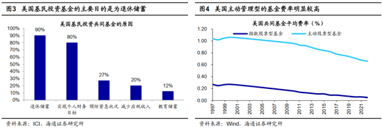 ①长期持有背景下被动投资复利效应明显。根据美国投资公司协会ICI的调查报告,90%的美国基民投资共同基金的首要目标是为了满足退休后的养老需求,可见这部分出于养老目的而入市的居民资金不仅规模庞大、同时投资持有期极长。被动管理产品相较主动产品往往具有费用率更低、权益仓位更高的优势,在40年的投资持有期假设下,低费率高仓位的被动投资复利效应将被显著放大。