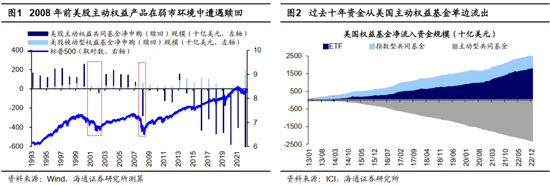 ②过去美股被动型管理基金相对主动型存在稳定长期超额收益。参考晨星Morningstar的统计数据,美股各风格类型的权益基金产品中,大部分被动型产品在过去十年均能战胜主动型产品,即美股主动管理在创造超额收益方面没有明显优势。此外,在前几轮美股弱市下跌中主动型权益基金也并未展现出更优的防御属性,因此资金对于主动型产品的偏好逐渐减弱。