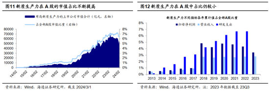 A股主题类ETF相较美股更加活跃,或源于国内产业升级的宏观背景。如前所述,相较美国,中国A股中板块主题型ETF占整体权益ETF规模比重更高,这或许主要源自于美国的产业结构已较为稳定,而我国正处于经济结构调整、转型升级、新旧动能转换的战略机遇期,过去十年我国的经济和股市结构都发生了明显的变化。我们以战略新兴产业占比观察新质生产力在经济中的占比情况,根据国家统计局的数据,我国战略性新兴产业占GDP比重已从2014年的7.6%上升至2022年的13%以上。A股层面来看,新质生产力板块在A股中的市值占比不断提升,从14年初的0.3%上升至目前(截至2024/3/1)的6.6%,目前总市值规模已达5.4万亿元。此外,新质生产力板块的归母净利润总值占A股比重自13年末的0.5%上升至23Q3的3.4%,营业收入总值占比自0.4%上升至23Q3的2.8%,研发支出总值占比自0.2%上升至2022年的6.7%。随着政策持续加码支持新质生产力发展,我国高增长的新兴产业不断涌现,相应的投资机会层出不穷,因此行业主题类ETF在A股迎来持续增长。