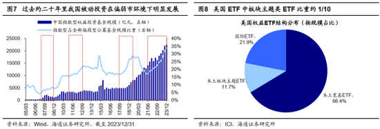 结构层面看,当前A股行业主题类ETF比重相较美国更高。进一步拆分美国被动型基金的结构,以美国ETF为例,2022年其本土股市宽基指数:国际股市:本土行业主题的规模对比比例约为6:2:1,即本土板块主题ETF的规模在整体权益ETF中的比重仅约1/10;反观中国A股,截止2023年底A股ETF中主题类ETF的比例超过40%,截止2024/03/08该比例有所下降,但在整体ETF中仍占据约1/3的比重,A股ETF中行业主题类ETF的占比明显较高。