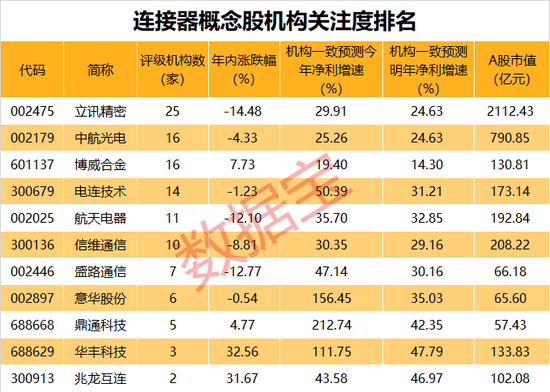 数据宝统计,连接器概念股中,机构关注度最高的是立讯精密,合计有25家机构评级。另外,中航光电、博威合金、电连技术、航天电器等个股均有10多家机构评级。