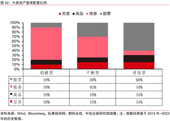 为匹配不同风险偏好的投资者需求,我们设置了稳健、平衡、进取三种配置风格。一级资产类别方面,我们使用目标波动率模型计算战略配置中枢,即在一定的目标波动率约束下(稳健、平衡、进取分别对应5%、8%、15%的目标波动率),以最大化投资组合预期收益为目标进行优化求解。