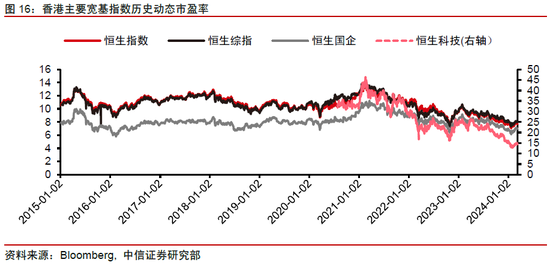 基本面:我们预计国内宏观经济稳步修复带来市场活力提升,企业营收有望改善。根据彭博一致预期数据,2024年港股加权指数的业绩增速或将放缓,但市场整体业绩预测增速仍有望实现小幅提升。营收预测方面同比改善,2024年恒生综指、恒生指数、恒生科技指数、恒生国企指数的营收增速预期分别为6.2%/5.8% /11.1%/6.7%,全年营收预测增速较2023年预测增速变化+1.1/-2.6/+2.7/+3.9个百分点。