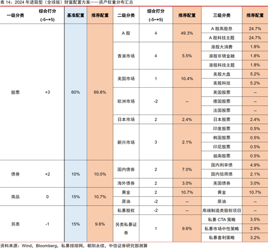 平衡型(国内版)财富配置方案:2024年建议超配股票和债券、低配商品与另类资产。具体来看,股票、债券、商品、另类资产的配置比例分别为36.2%、46.5%、7.4%、10.0%。股票内部,A股、港股的配置比例分别为32.6%、3.6%;债券内部,国内利率债、国内信用债的配置比例分别为32.5%、13.9%;商品内部,黄金的配置比例为7.4%;另类资产内部,私募CTA策略、市场中性策略、套利策略的配置比例分别为3.6%、3.0%、3.3%。