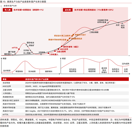 新质生产力有望引领新一轮产业投资机会。我们认为,上游基础设施建设先行且最具确定性,核心在于新型要素建设(数据、算力)与配套(能源、材料、基础软件、基础装备等)。下游产业布局建议率先关注从导入期进入成长期的大模型应用、人形机器人、自动驾驶、新材料、卫星互联网、低空经济、生物技术等。