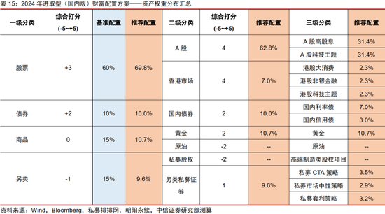 进取型(国内版)财富配置方案:2024年建议超配股票、平配债券、低配商品与另类资产。具体来看,股票、债券、商品、另类资产的配置比例分别为69.8%、10.0%、10.7%、9.6%。股票内部,A股、港股的配置比例分别为62.8%、7.0%;债券内部,国内利率债、国内信用债的配置比例分别为7.0%、3.0%;商品内部,黄金的配置比例为10.7%;另类资产内部,私募CTA策略、市场中性策略、套利策略的配置比例分别为3.5%、2.9%、3.2%。