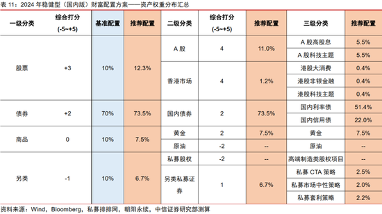 稳健型(国内版)财富配置方案:2024年建议超配股票和债券、低配商品与另类资产。具体来看,股票、债券、商品、另类资产的配置比例分别为12.3%、73.5%、7.5%、6.7%。股票内部,A股、港股的配置比例分别为11.0%、1.2%;债券内部,国内利率债、国内信用债的配置比例分别为51.4%、22.0%;商品内部,黄金的配置比例为7.5%;另类资产内部,私募CTA策略、市场中性策略、套利策略的配置比例分别为2.5%、2.0%、2.2%。