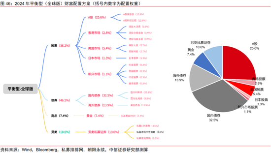 平衡型(全球版)财富配置方案:2024年建议超配股票和债券、低配商品与另类资产。具体来看,股票、债券、商品、另类资产的配置比例分别为36.2%、46.5%、7.4%、10.0%。股票内部,A股、港股、美股、日本股票、新兴市场股票的配置比例分别为25.6%、2.8%、5.4%、1.3%、1.1%;债券内部,国内债券和美国债券的配置比例分别为32.5%、13.9%;商品内部,黄金的配置比例为7.4%;另类资产内部,私募CTA策略、市场中性策略、套利策略的配置比例分别为3.6%、3.0%、3.3%。