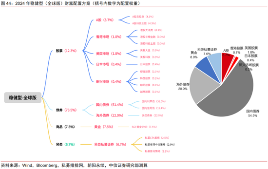 稳健型(全球版)财富配置方案:2024年建议超配股票和债券、低配商品与另类资产。具体来看,股票、债券、商品、另类资产的配置比例分别为12.3%、73.5%、7.5%、6.7%。股票内部,A股、港股、美股、日本股票、新兴市场股票的配置比例分别为8.7%、0.7%、1.8%、0.4%、0.4%;债券内部,国内债券和美国债券的配置比例分别为51.4%、22%;商品内部,黄金的配置比例为7.5%;另类资产内部,私募CTA策略、市场中性策略、套利策略的配置比例分别为2.5%、2.0%、2.2%。