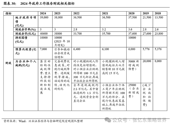 最后,2024年政府工作报告经济和通胀预期目标较为积极。2024年GDP增速预期目标为5%左右,持平于2023年目标,在去年经济增长进一步回归正常的背景之下,今年低基数效应消退,这一目标整体较为积极。经历2023年低通胀环境,2024年通胀预期目标3%左右,也较为积极。