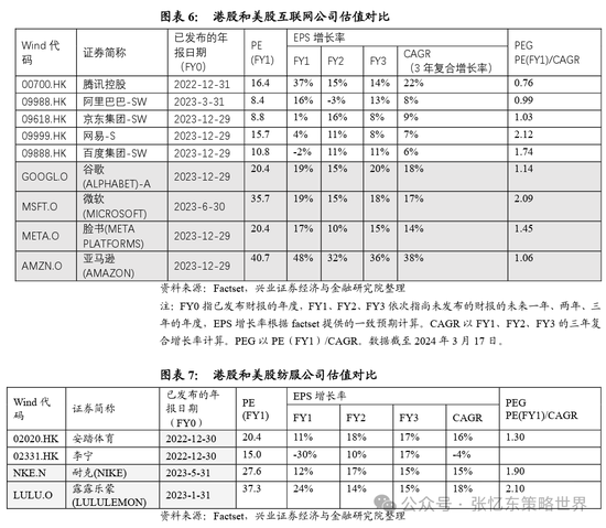 以消费行业为例,以纺服公司为例,港股安踏、李宁的PE分别为15.0倍、20.4倍,而美股耐克、露露乐蒙的PE分别为27.6倍、37.3倍。安踏的PEG仅1.3倍,耐克、露露乐蒙的PEG分别为1.9倍、2.1倍。