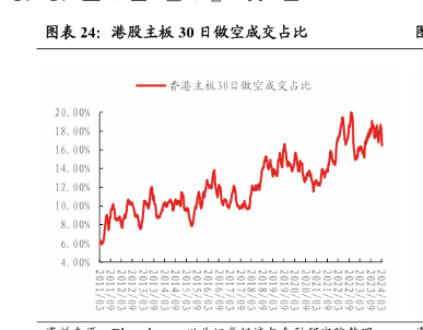 随后是2024年做空港股的交易可能被逆转。随着港股的估值本身已经严重折价,以及流动性环境和国内经济环境边际向上,过去两年在港股盛行的做空交易开始收缩。2023年9月到2024年2月,港股主板30日做空成交占比在18%上下波动,2024年3月(截至3月15日)做空成交占比下降到了16.6%。但从历史来看,这个做空水平依然偏高。