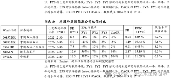 传统行业,以能源公司为例,港股中国石油股份、中国海洋石油、中国石油化工股份PE在5-7倍的区间,而美股埃克森美孚、雪佛龙PE在12倍左右。中国石油股份、中国海洋石油、中国石油化工股份的股息收益率分别为7.2%、7.6%、8.2%,美股埃克森美孚、雪佛龙的股息和回购收益率分别为6.2%、6.8%。
