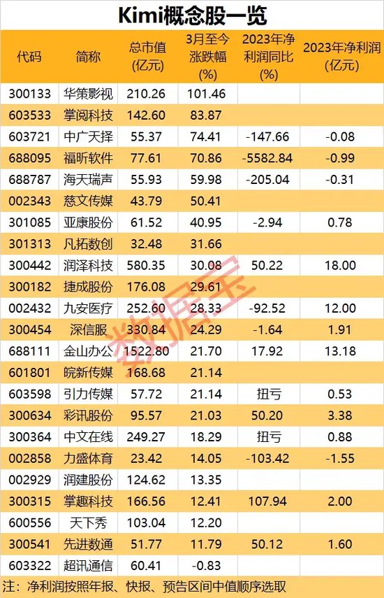 据证券时报·数据宝不完全梳理,A股市场上,Kimi概念股约23只。受益于Kimi消息面的利好催化,3月至今,概念股集体大涨。
