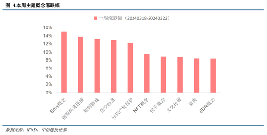 AI算力和应用方向、铜缆高速连接、短剧游戏等相关概念板块热度不断。主题概念方面,本周Sora概念、铜缆高速连接领涨,分别上涨14.97%、13.75%。本次两会,人工智能首次出现在中央官方会议中,开展“人工智能+”行动,打造具有国际竞争力的数字产业集群。3月19日,英伟达在GTC大会发布采用铜缆连接的首款Blackwell芯片GB200,实现了成本的大幅节约,节约比例高达6倍,为AI领域注入了革命性的活力,引爆市场。此外,本周Kimi智能助手大火,其背后的AI大模型能够为游戏互动、影视创作等多行业赋能。多方催化下,本周AI算力和应用方向、铜缆高速连接、短剧游戏等概念板块热度高涨。