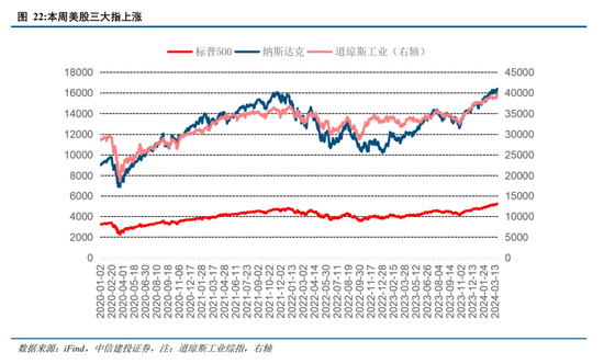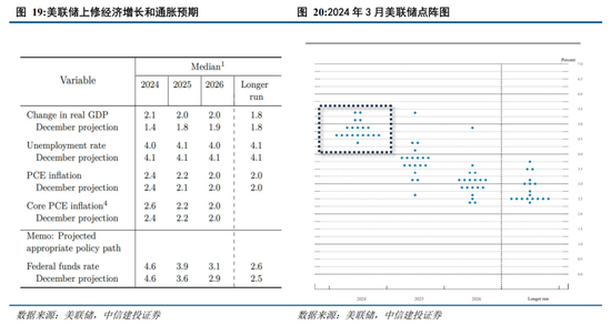 美联储降息中性偏鸽,仍保持年内降息三次的预测。美东时间3月20日,美联储召开 3 月 FOMC 会议。2024年第一季度美国经济数据普遍好于预期,推动美联储上调经济增长和通胀预期,下调失业率预期。其中,2024年的经济增速预测上调至2.1%(2023年12月为1.4%);2024年的失业率预测下调至4.0%(2023年12月为4.1%);2024年核心通胀上调至2.6%(2023年12月为2.4%)。我们认为鲍威尔的表述中性偏鸽派,主要集中3个方面:1)通胀数据解读偏鸽派。鲍威尔表示2024年年初通胀数据较高主要受季节性因素的影响,通胀回落趋势未改变。2)关注就业下行风险。鲍威尔认为不排除5月降息的可能性(对比1月发布会中鲍威尔认为5月降息太早),如果就业市场意外走弱,降息将是合适的。3)降息约束条件或有放松。美联储在上调经济增速和通胀预期后,本次点阵图仍保留了年内三次降息的预期,美联储降息门槛或有降低。