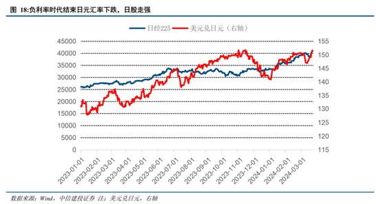 日本央行结束负利率时代,市场前期已充分预期。北京时间2024年3月19日,日本央行召开货币政策会议,正式宣布退出负利率和收益率曲线控制(YCC)政策。本次调整原因主要来自两方面1) 日本基本面复苏。GDP方面,日本GDP实现温和增长,日本23年GDP同比增长为5.70%(现价口径统计),经济总量连续三年增长。CPI方面,24年1月日本CPI同比增速为2.20%,核心CPI(不含新鲜食品)同比增速为2.0%,连续22个月超过既定目标2.0%,通胀水平已经脱离较低水平。2) 薪资谈判效果显著。3月15日日本最大工会组织成员加薪幅度为5.28%,大大超出去年的3.8%,创30年来的最大涨幅,薪资水平的涨幅已经与物价匹配。今年以来,日本央行多位官员均曾公开表示更高的工资水平能带来服务业通胀和实际消费增长,可以展望实现工资和物价的良性循环。本次结果或增强了日本央行结束负利率政策的信心。会议结束至3月22日,美元兑日元跌破150,日股走强突破4万点。