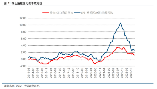 瑞士央行意外降息,或将开启全球货币政策宽松潮。北京时间2024年3月21日,瑞士央行(SNB)意外将关键利率下调25个基点,是本轮周期中第一个降息的全球主要发达国家央行。瑞士央行表示过去两年半的抗通胀之战得了明显的效果。对比来看,瑞士的CPI当月同比显著低于欧元区19国的当月同比,瑞士通胀压力低于欧元区整体水平。同时,本次瑞士央行意外降息也或是为了提前应对年中美联储和欧州央行可能的降息而导致瑞法郎面临的潜在升值压力。瑞士央行降息或将预示全球主要央行进入宽松政策周期。