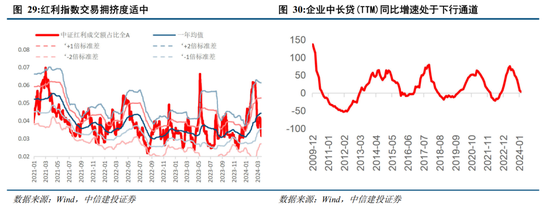 另一方面,结合行业产业周期判断,从业绩趋势中我们也可以得出三条中期配置线索:高股息、新质生产力及海外定价品。前期我们在关于高股息报告的深度研究中指出,参照美日经验,企业部门信贷周期是影响高股息策略相对收益最本质的宏观指标,其底层逻辑在于,去杠杆/紧信用环境下企业中期增速预期降低,导致估值中枢下行,相反,盈利增速已在中低位中枢维持稳健、丧失成长性的高股息资产对于杠杆/信贷周期的敏感度较低,盈利预期及估值水平受影响程度小,构成其跑赢的底层逻辑;从微观角度看,去杠杆/紧信用环境下企业自由现金流分配意愿也会发生改变,企业将现金用于分红/回购等提升股东即时回报的意愿将有所上行。从2月最新社融的情况看,企业中长贷滚动12个月同比增速依旧处于下行通道,M2-M1剪刀差走阔也预示自发性融资意愿的低迷状态,我们判断高股息风格仍将维持相对收益占优表现,且目前交易拥挤度等指标也未显示出现明显泡沫化现象。另一方面,参考日本90年代经验,优势产业和结构性信贷扩张的方向依旧可以实现跑赢,内需关注新质生产力(科技尤其AI方向)、外需把握海外定价品(有色、石油)及中期出海逻辑。