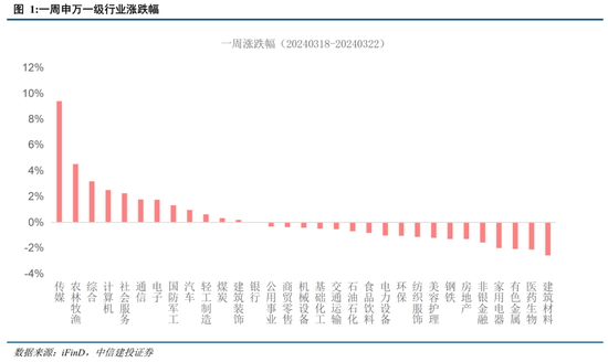市场横盘震荡,修复行情暂告段落。本周三大指数收跌,上证指数、深证成指、创业板指本周分别下跌0.22%、0.49%、0.79%。中证500下跌1.28%、中证1000上涨0.72%。本周市场主题轮动暂告段落,重视一季报基本面。一级行业涨跌分化,31个申万一级行业,其中传媒(9.40%)、农林牧渔(4.49%)、计算机(2.49%)、社会服务(2.24%)、通信(1.77%)、电子(1.74%)涨幅居前,建筑材料(-2.59%)、医药生物(-2.13%)领跌。市场风格维度,国证价值下跌0.84%,国证成长下跌1.01%,成长股由增转跌,价值股跌幅减小。