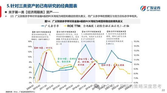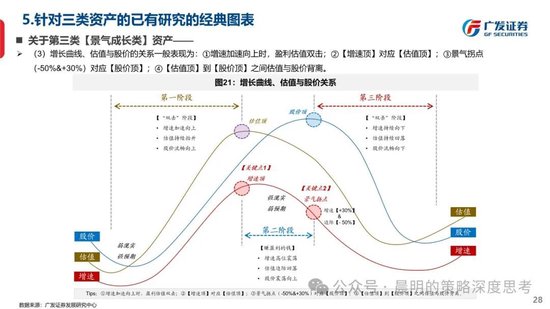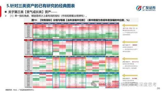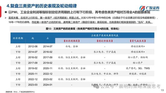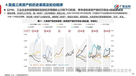 在经济上行阶段,第一类资产(经济周期类)明显占优。而在第一类资产占优的阶段,通常第二类资产(稳定价值类)表现较弱,也就是我们框架里提到的“互斥”关系。而对于第三类资产(景气成长类),在不同经济周期或者市场风格之下,都可能有表现非常突出的资产。